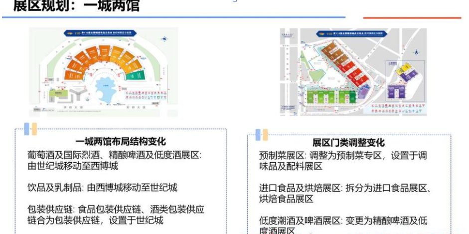 1.葡萄酒及国际烈酒、精酿啤酒及低度酒由原来的世纪城展馆移动到了西博城展馆。